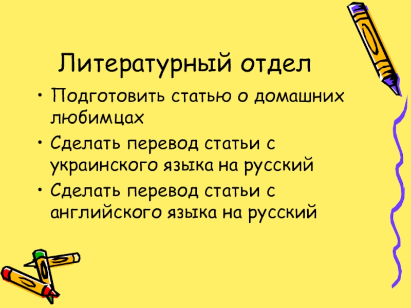 Литературный отделПодготовить статью о домашних любимцахСделать перевод статьи с украинского языка на русскийСделать перевод статьи с английского