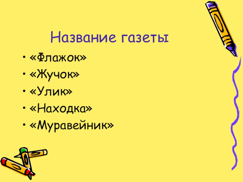 Название газеты«Флажок»«Жучок»«Улик»«Находка»«Муравейник»