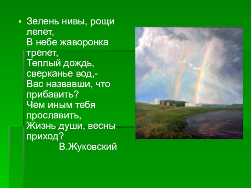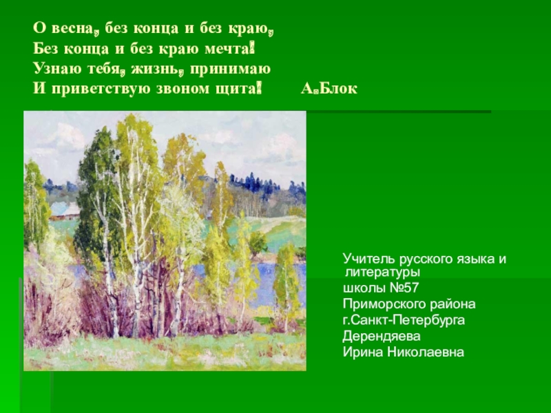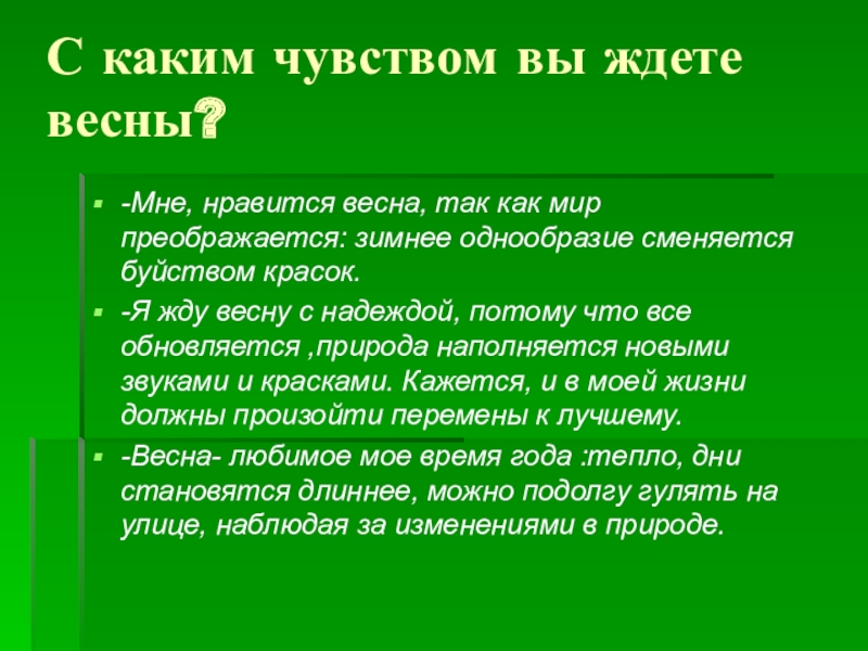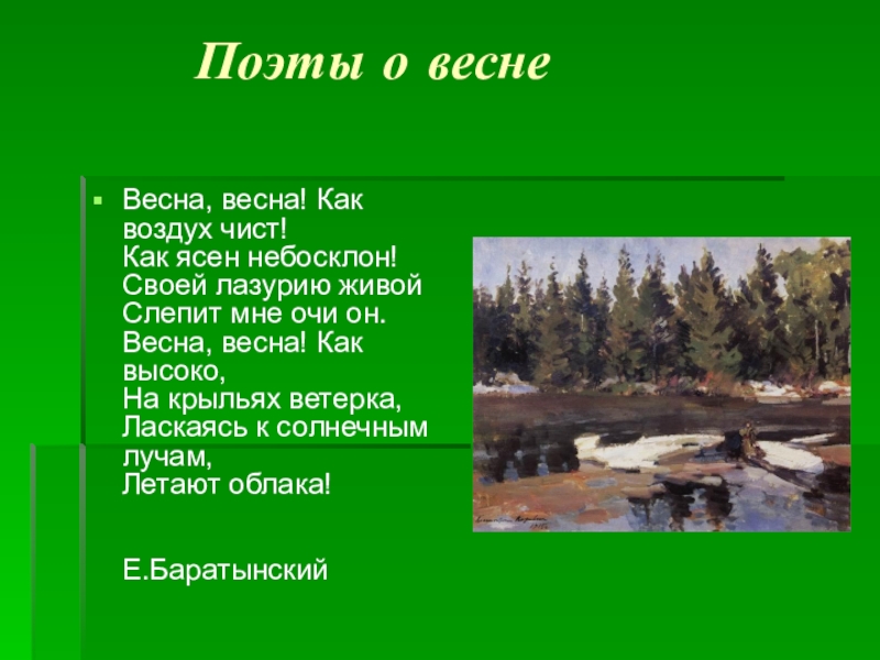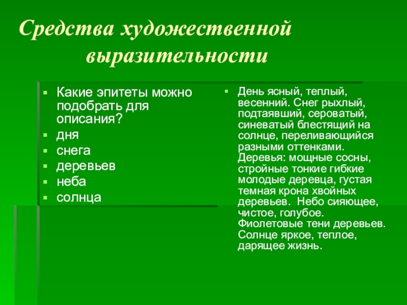 День лучезарен; снег тает и превращается в бегущие ручейки; деревья протягивают свои руки-ветви к небу и солнцу; небо похоже на голубое блюдо; солнце пригревает и оживляет все вокруг.