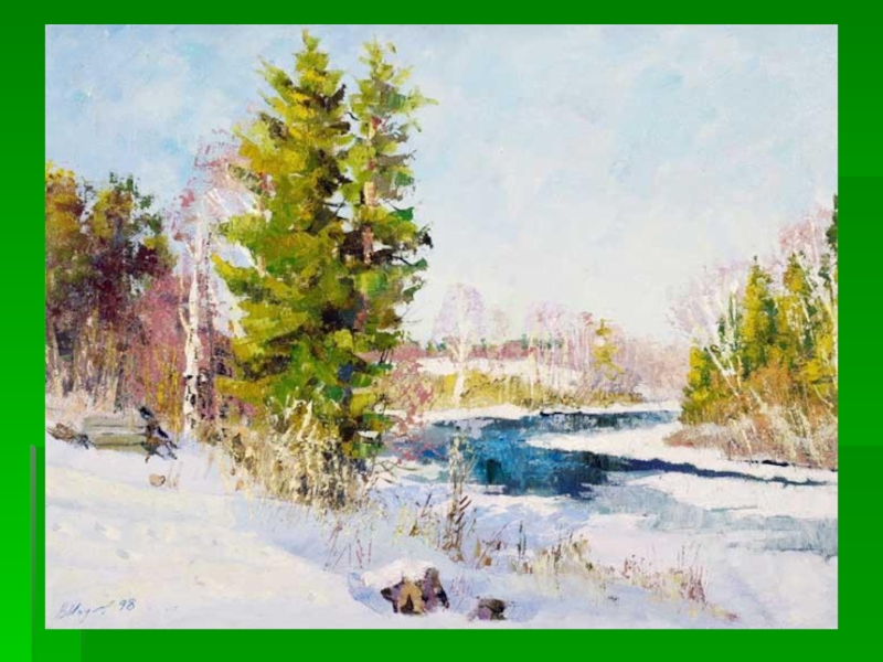 День ясный, теплый, весенний. Снег рыхлый, подтаявший, сероватый, синеватый блестящий на солнце, переливающийся разными оттенками. Деревья: мощные сосны, стройные тонкие гибкие молодые деревца, густая темная крона хвойных деревьев. Небо сияющее, чистое, голубое. Фиолетовые тени деревьев. Солнце яркое, теплое, дарящее жизнь.