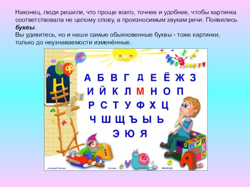 Наконец, люди решили, что проще всего, точнее и удобнее, чтобы картинка соответствовала не целому слову, а произносимым