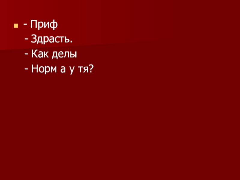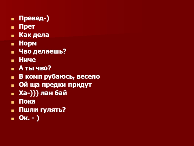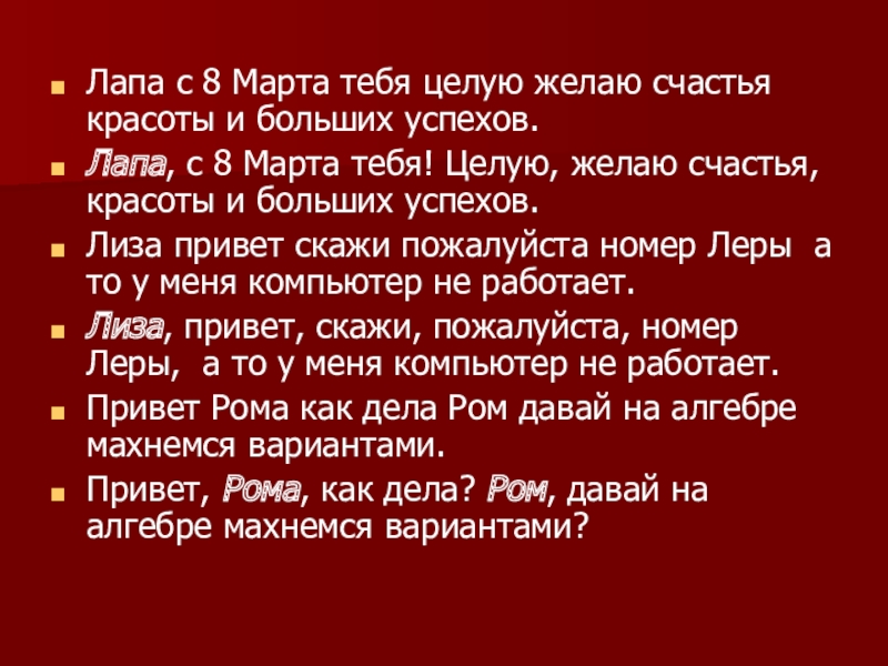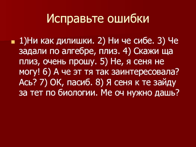 по алгебре, плиз. 4) Скажи ща плиз, очень прошу. 5) Не, я сеня не могу! 6) А че эт тя так заинтересовала? Ась? 7) ОК, пасиб. 8) Я сеня к те зайду за тет по биологии. Ме оч нужно дашь?
