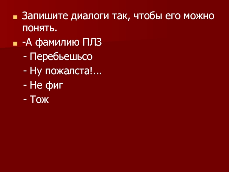 Слайд 12Запишите диалоги так, чтобы его можно понять.