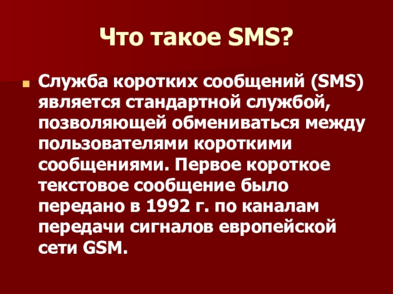 между пользователями короткими сообщениями. Первое короткое текстовое сообщение было передано в 1992 г. по каналам передачи сигналов европейской сети GSM.