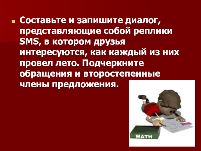 Составьте и запишите диалог, представляющие собой реплики SMS, в котором друзья