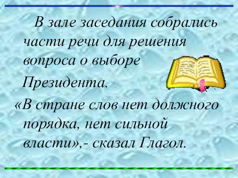 В зале заседания собрались части речи для решения вопроса о выборе Президента.«В стране слов
