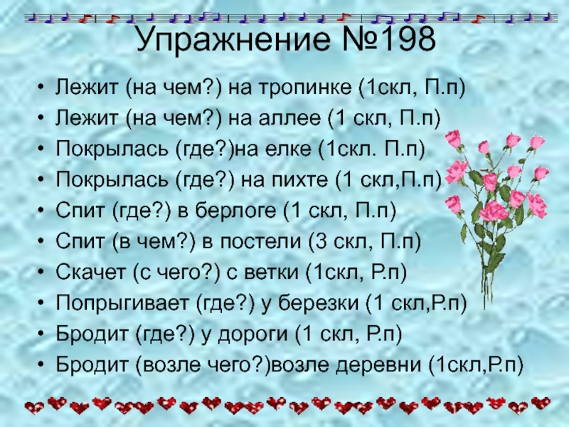 Упражнение №198Лежит (на чем?) на тропинке (1скл, П.п)Лежит (на чем?) на аллее (1 скл, П.п)Покрылась (где?)на елке