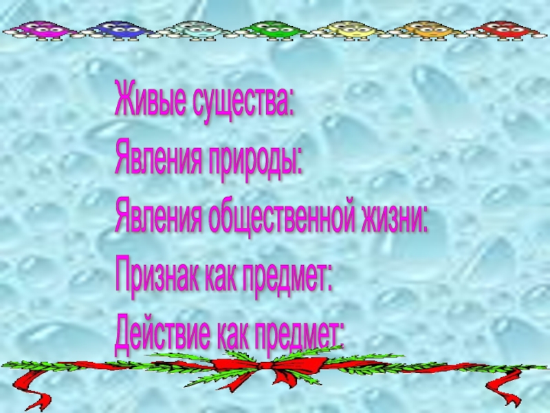 Живые существа:  Явления природы:  Явления общественной жизни:  Признак как предмет:  Действие как предмет: