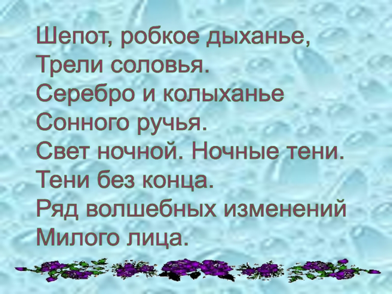 Шепот, робкое дыханье,  Трели соловья.  Серебро и колыханье  Сонного ручья.  Свет ночной. Ночные