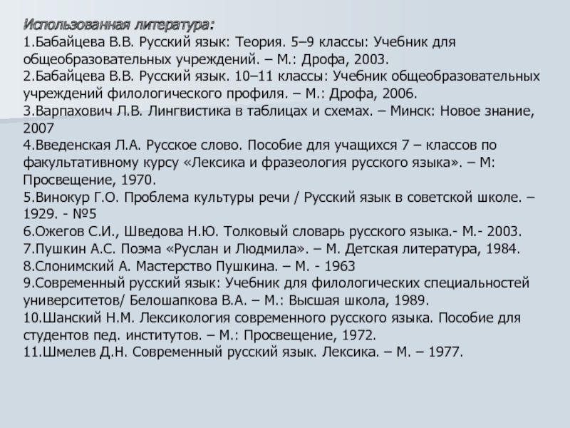 10.Шанский Н.М. Лексикология современного русского языка. Пособие для студентов пед. институтов. – М.: Просвещение, 1972.