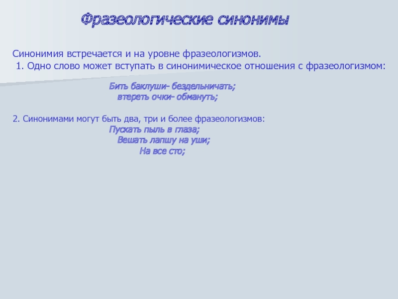 Слайд 9Синонимия встречается и на уровне фразеологизмов.