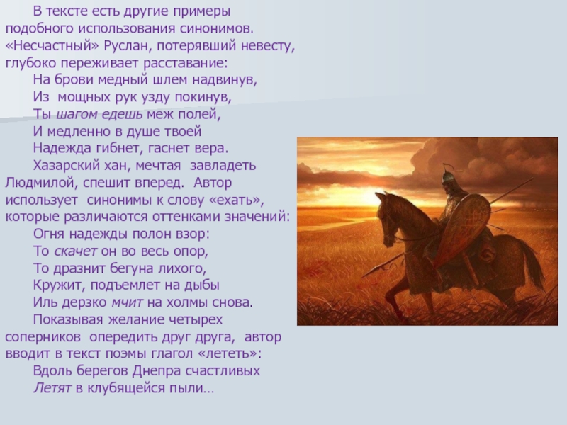 Слайд 14Хазарский хан, мечтая завладеть Людмилой, спешит вперед. Автор использует синонимы к