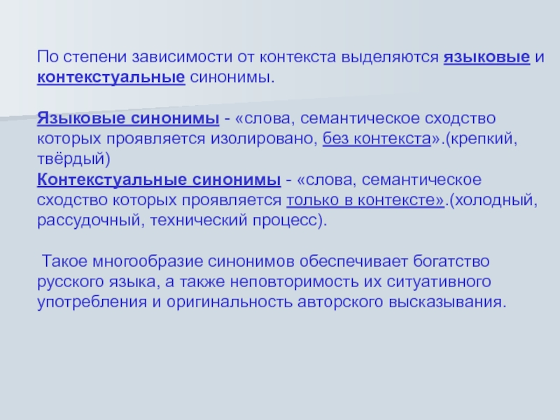 Слайд 7По степени зависимости от контекста выделяются языковые и контекстуальные синонимы.