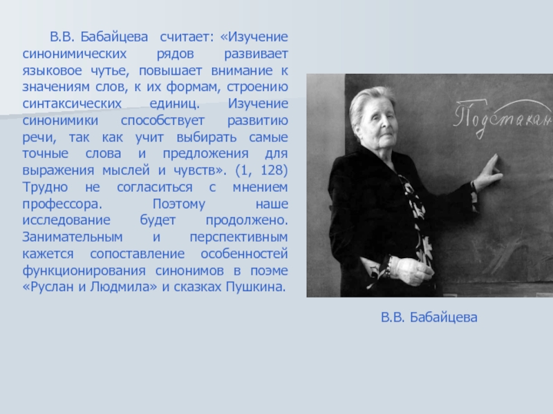 Слайд 20В.В. Бабайцева считает: «Изучение синонимических рядов развивает языковое чутье, повышает внимание