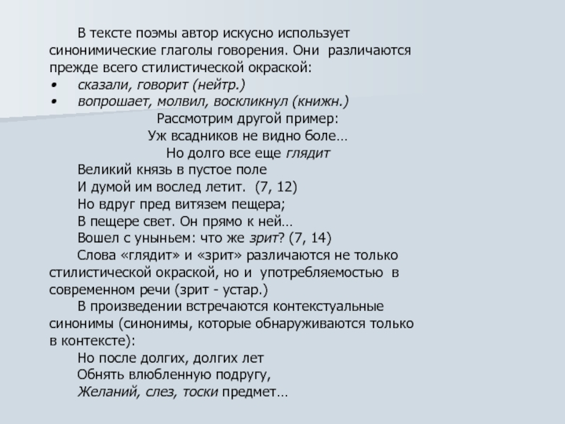 Слайд 16В тексте поэмы автор искусно использует синонимические глаголы говорения. Они различаются