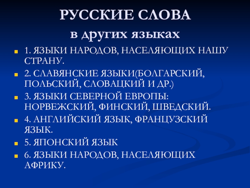 РУССКИЕ СЛОВА в других языках1. ЯЗЫКИ НАРОДОВ, НАСЕЛЯЮЩИХ НАШУ СТРАНУ.2. СЛАВЯНСКИЕ ЯЗЫКИ(БОЛГАРСКИЙ, ПОЛЬСКИЙ, СЛОВАЦКИЙ И ДР.)3. ЯЗЫКИ СЕВЕРНОЙ ЕВРОПЫ: НОРВЕЖСКИЙ, ФИНСКИЙ, ШВЕДСКИЙ.4. АНГЛИЙСКИЙ ЯЗЫК, ФРАНЦУЗСКИЙ ЯЗЫК.5. ЯПОНСКИЙ ЯЗЫК6. ЯЗЫКИ НАРОДОВ, НАСЕЛЯЮЩИХ АФРИКУ.