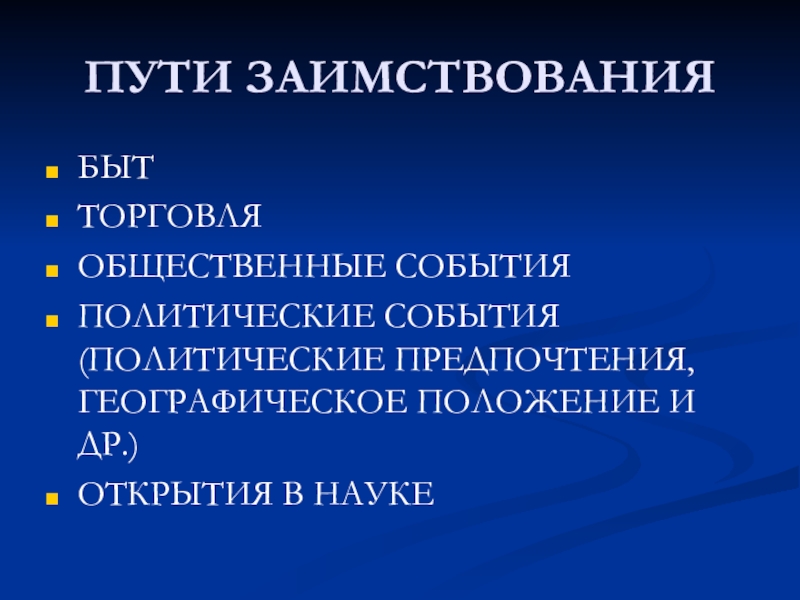 ПУТИ ЗАИМСТВОВАНИЯБЫТТОРГОВЛЯОБЩЕСТВЕННЫЕ СОБЫТИЯПОЛИТИЧЕСКИЕ СОБЫТИЯ (ПОЛИТИЧЕСКИЕ ПРЕДПОЧТЕНИЯ, ГЕОГРАФИЧЕСКОЕ ПОЛОЖЕНИЕ И ДР.)ОТКРЫТИЯ В НАУКЕ