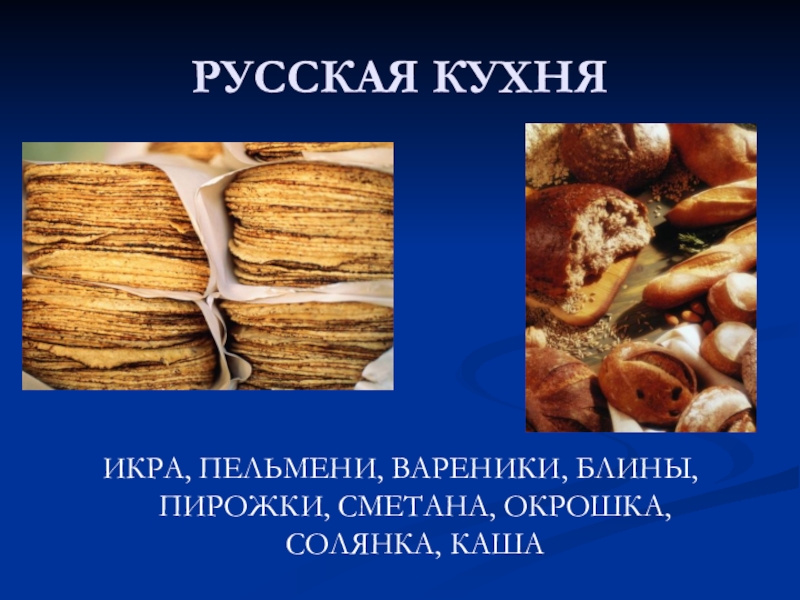 РУССКАЯ КУХНЯИКРА, ПЕЛЬМЕНИ, ВАРЕНИКИ, БЛИНЫ, ПИРОЖКИ, СМЕТАНА, ОКРОШКА, СОЛЯНКА, КАША