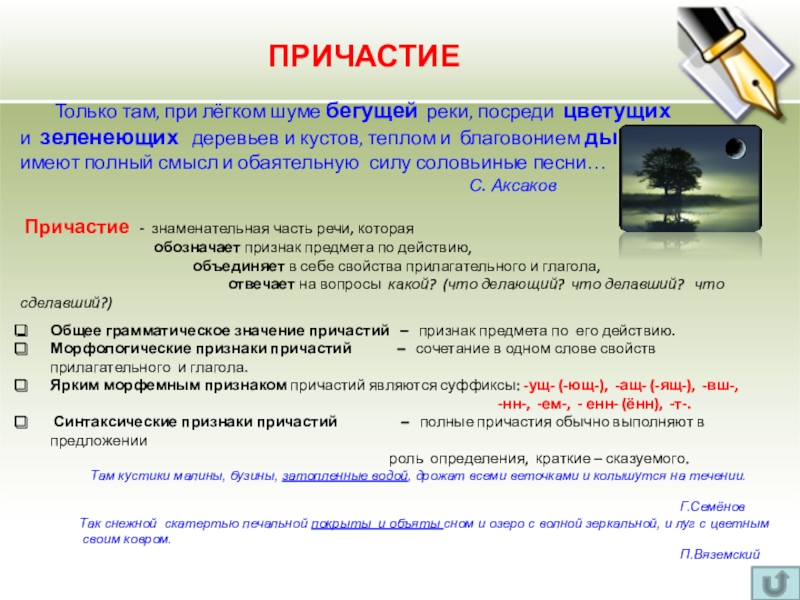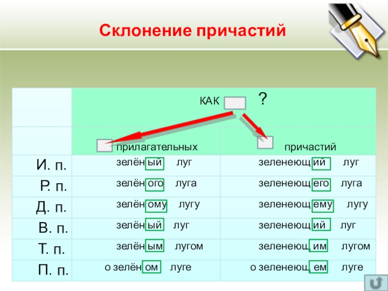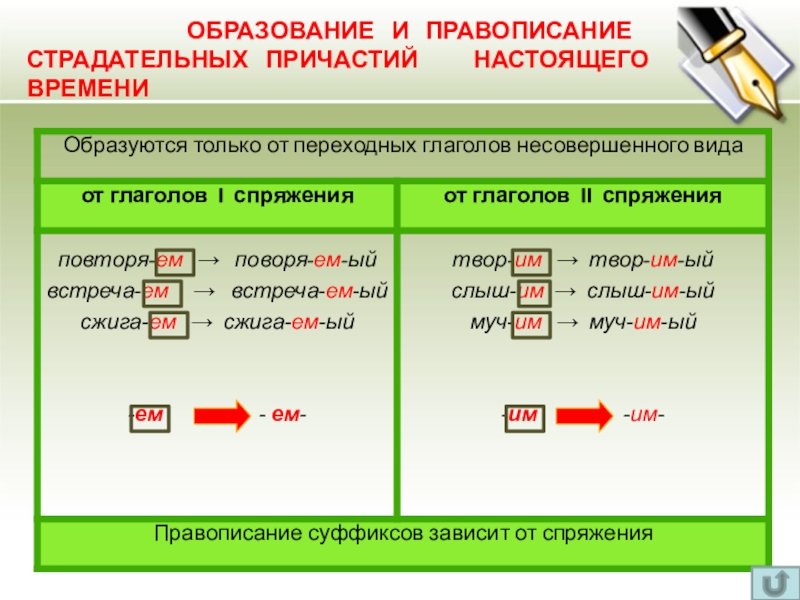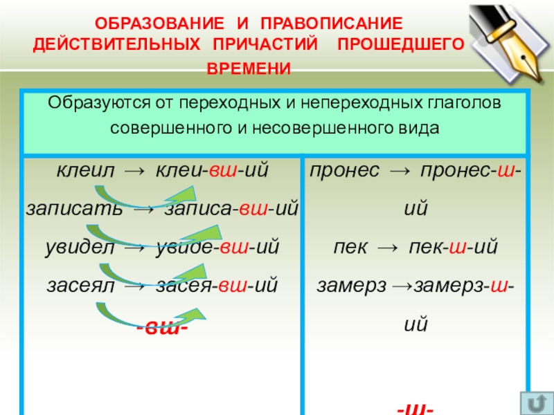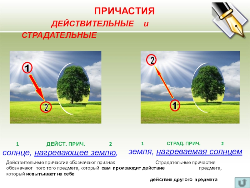 Действительные причастия обозначают признак Страдательные причастия обозначают того того предмета, который сам производит действие предмета, который испытывает на себе