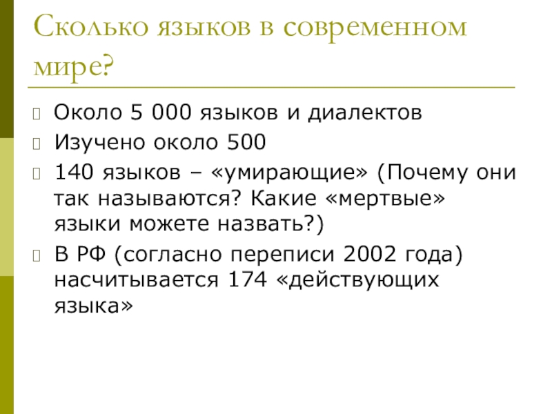 140 языков – «умирающие» (Почему они так называются? Какие «мертвые» языки можете назвать?)