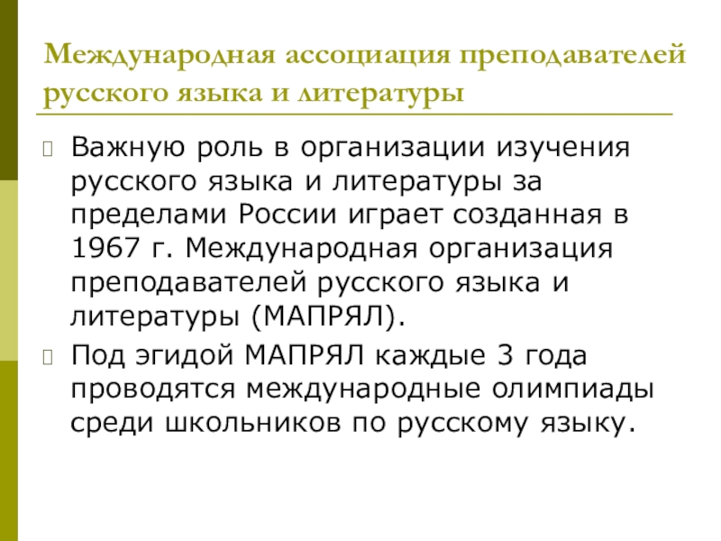 русского языка и литературы за пределами России играет созданная в 1967 г. Международная организация преподавателей русского языка и литературы (МАПРЯЛ).