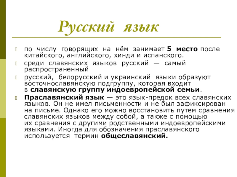 Праславянский язык — это язык-предок всех славянских языков. Он не имел письменности и не был зафиксирован на письме. Однако его можно восстановить путем сравнения славянских языков между собой, а также с помощью их сравнения с другими родственными индоевропейскими языками. Иногда для обозначения праславянского используется термин общеславянский.