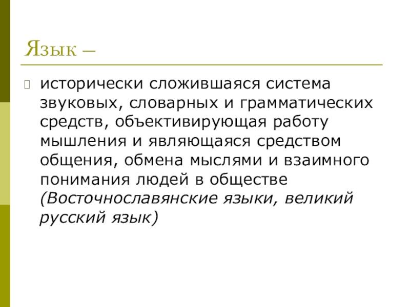 мышления и являющаяся средством общения, обмена мыслями и взаимного понимания людей в обществе (Восточнославянские языки, великий русский язык)