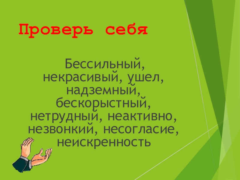 Проверь себя	Бессильный, некрасивый, ушел, надземный, бескорыстный, нетрудный, неактивно, незвонкий, несогласие, неискренность