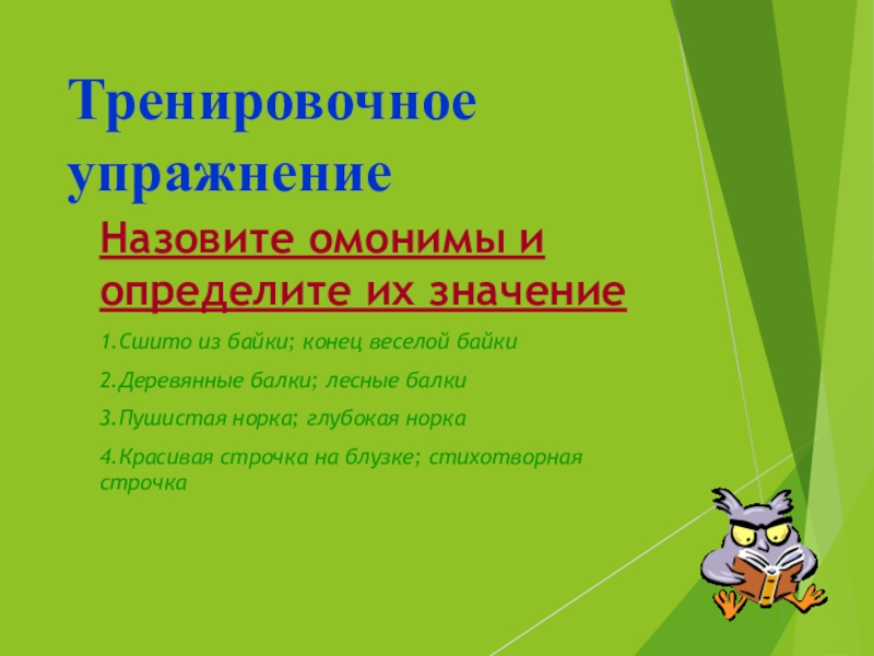 Тренировочное упражнениеНазовите омонимы и определите их значение1.Сшито из байки; конец веселой байки2.Деревянные балки; лесные балки3.Пушистая норка; глубокая