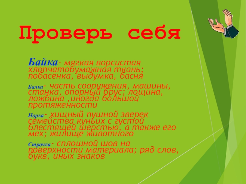 Проверь себяБайка- мягкая ворсистая хлопчатобумажная ткань; побасенка, выдумка, басняБалка- часть сооружения, машины, станка, опорный брус; лощина, ложбина