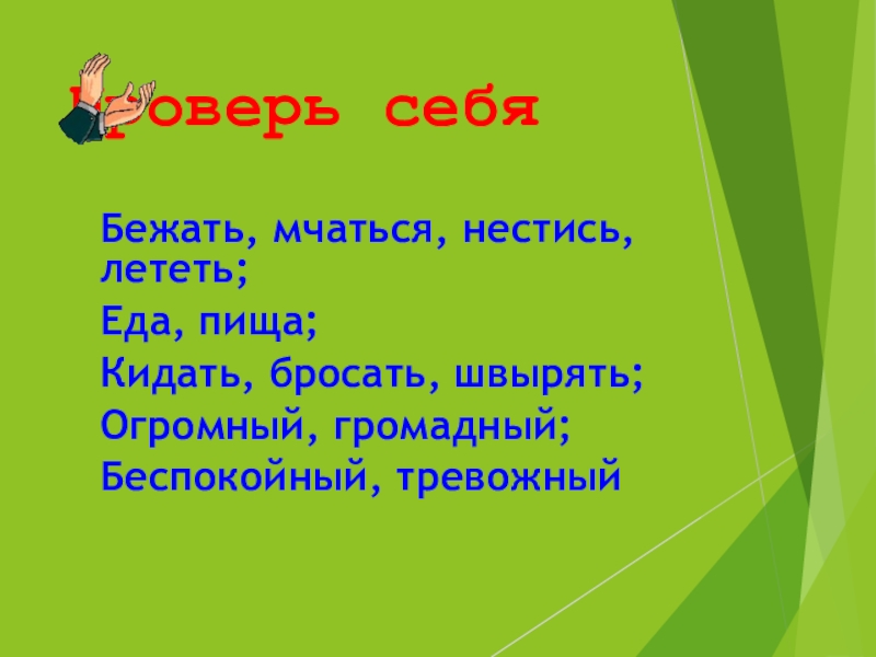 Проверь себяБежать, мчаться, нестись, лететь;Еда, пища;Кидать, бросать, швырять;Огромный, громадный;Беспокойный, тревожный