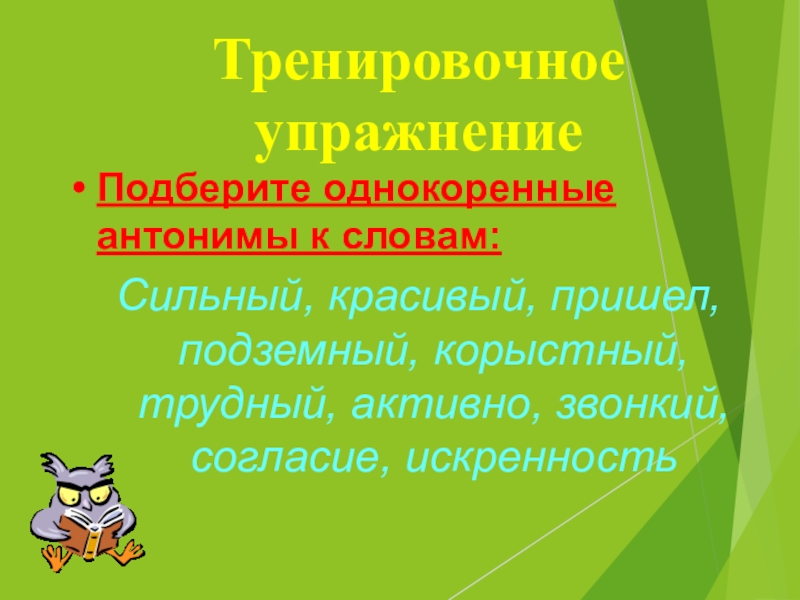 Тренировочное упражнениеПодберите однокоренные антонимы к словам:Сильный, красивый, пришел, подземный, корыстный, трудный, активно, звонкий, согласие, искренность