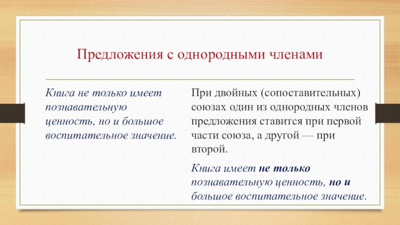 При двойных (сопоставительных) союзах один из однородных членов предложения ставится при первой части союза, а другой — при второй.