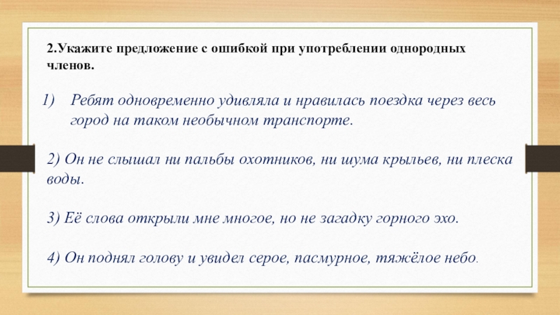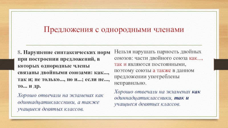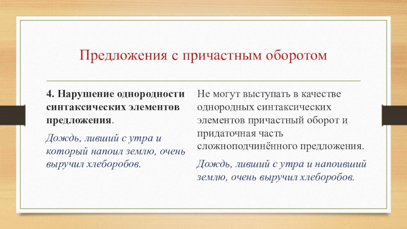 Не могут выступать в качестве однородных синтаксических элементов причастный оборот и придаточная часть сложноподчинённого предложения.