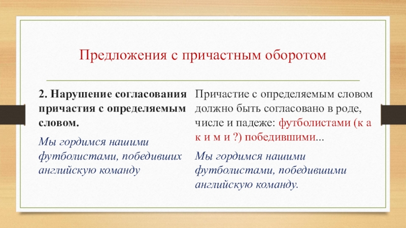 Причастие с определяемым словом должно быть согласовано в роде, числе и падеже: футболистами (к а к и м и ?) победившими...