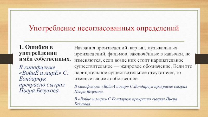 Названия произведений, картин, музыкальных произведений, фильмов, заключённые в кавычки, не изменяются, если возле них стоит нарицательное существительное — жанровое обозначение. Если это нарицательное существительное отсутствует, то изменяется имя собственное.