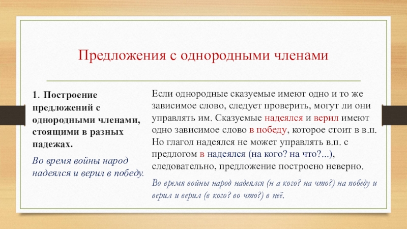 Если однородные сказуемые имеют одно и то же зависимое слово, следует проверить, могут ли они управлять им. Сказуемые надеялся и верил имеют одно зависимое слово в победу, которое стоит в в.п. Но глагол надеялся не может управлять в.п. с предлогом в надеялся (на кого? на что?...), следовательно, предложение построено неверно.