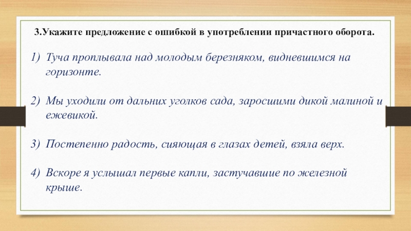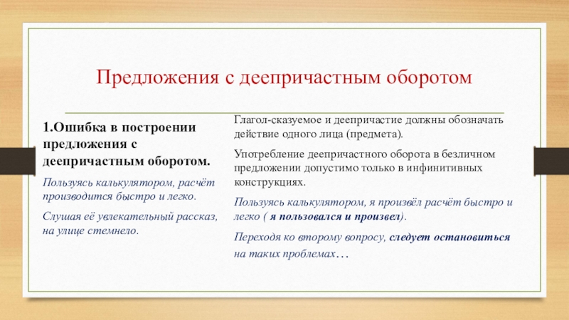 Глагол-сказуемое и деепричастие должны обозначать действие одного лица (предмета).