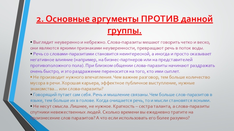 Слайд 42. Основные аргументы ПРОТИВ данной группы.