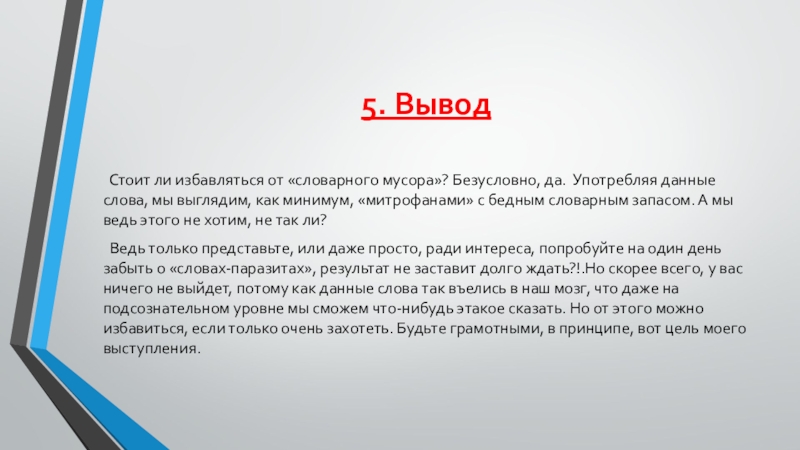Ведь только представьте, или даже просто, ради интереса, попробуйте на один день забыть о «словах-паразитах», результат не заставит долго ждать?!.Но скорее всего, у вас ничего не выйдет, потому как данные слова так въелись в наш мозг, что даже на подсознательном уровне мы сможем что-нибудь этакое сказать. Но от этого можно избавиться, если только очень захотеть. Будьте грамотными, в принципе, вот цель моего выступления.