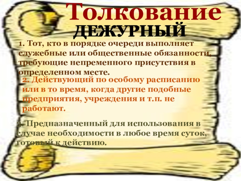 1. Тот, кто в порядке очереди выполняет служебные или общественные обязанности, требующие непременного присутствия в определенном месте.