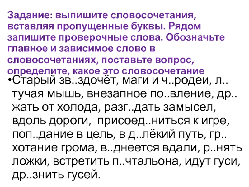 Старый зв..здочёт, маги и ч..родеи, л..тучая мышь, внезапное по..вление, др..жать от холода, разг..дать замысел, вдоль дороги, присоед..ниться к игре, поп..дание в цель, в д..лёкий путь, гр..хотание грома, в..днеется вдали, р..нять ложки, встретить п..чтальона, идут гуси, др..знить гусей.
