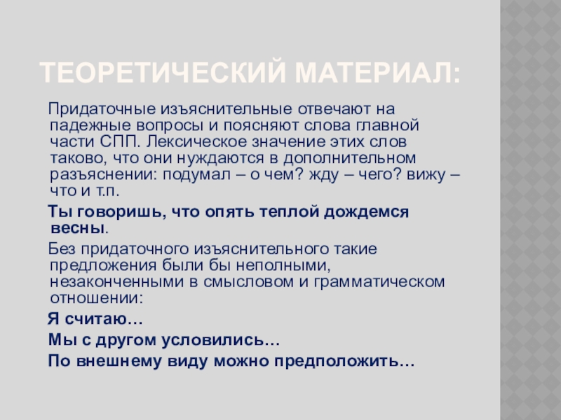 слова главной части СПП. Лексическое значение этих слов таково, что они нуждаются в дополнительном разъяснении: подумал – о чем? жду – чего? вижу – что и т.п.