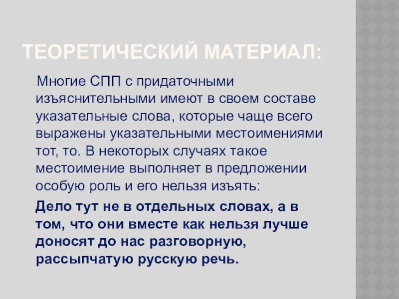 составе указательные слова, которые чаще всего выражены указательными местоимениями тот, то. В некоторых случаях такое местоимение выполняет в предложении особую роль и его нельзя изъять: