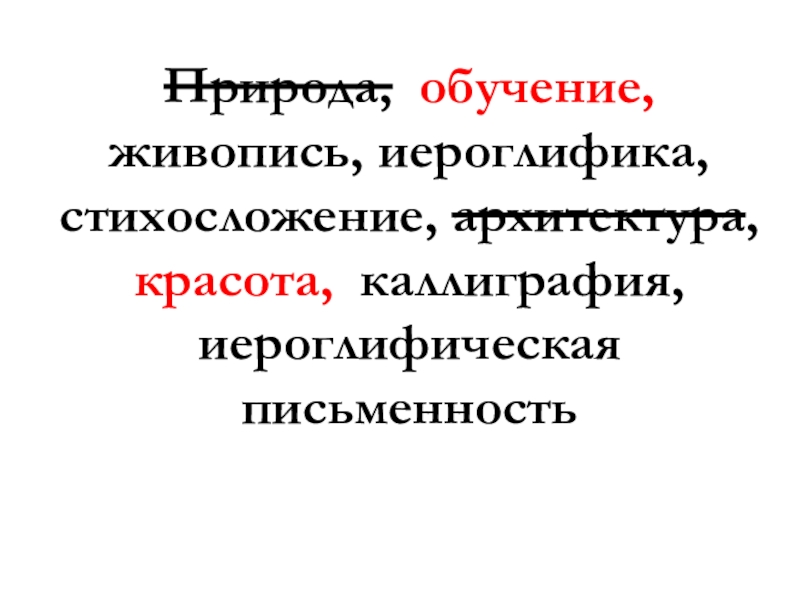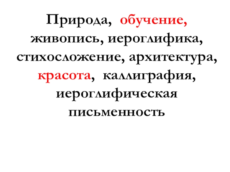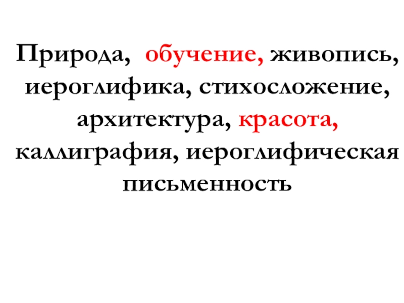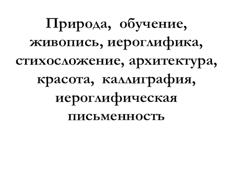 Слайд 16Природа, обучение, живопись, иероглифика, стихосложение, архитектура, красота, каллиграфия, иероглифическая письменность