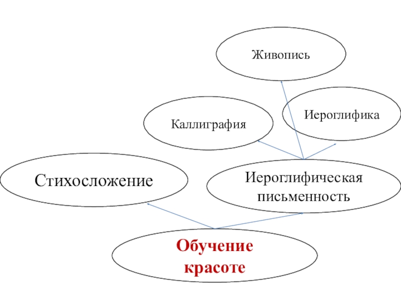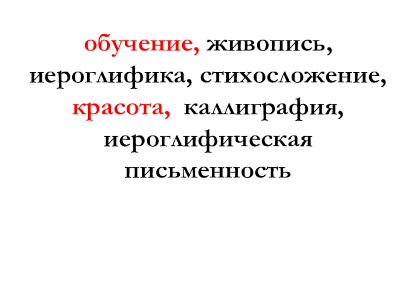 Слайд 17обучение, живопись, иероглифика, стихосложение, красота, каллиграфия, иероглифическая письменность