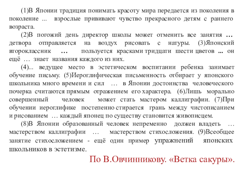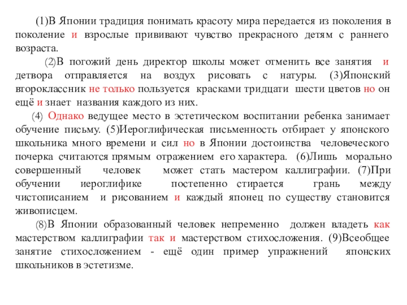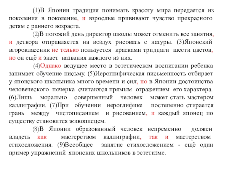 (4) Однако ведущее место в эстетическом воспитании ребенка занимает обучение письму. (5)Иероглифическая письменность отбирает у японского школьника много времени и сил но в Японии достоинства человеческого почерка считаются прямым отражением его характера. (6)Лишь морально совершенный человек может стать мастером каллиграфии. (7)При обучении иероглифике постепенно стирается грань между чистописанием и рисованием и каждый японец по существу становится живописцем.