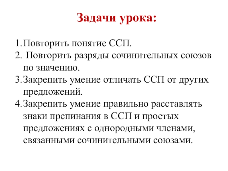 Закрепить умение правильно расставлять знаки препинания в ССП и простых предложениях с однородными членами, связанными сочинительными союзами.