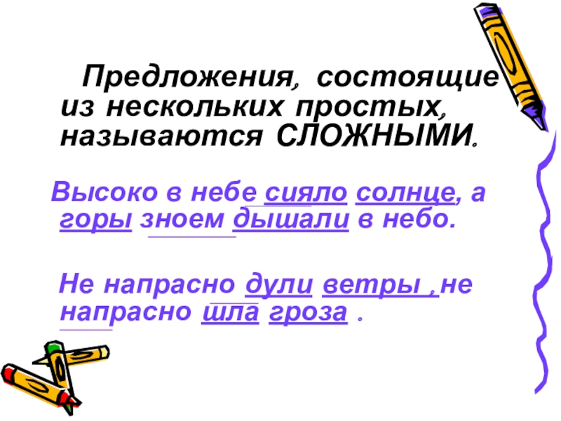 Предложения, состоящие из нескольких простых, называются СЛОЖНЫМИ.   Высоко в небе сияло солнце,