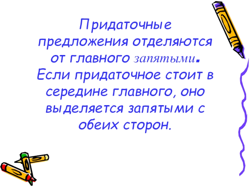 Слайд 7Придаточные предложения отделяются от главного запятыми. Если придаточное стоит в середине главного,